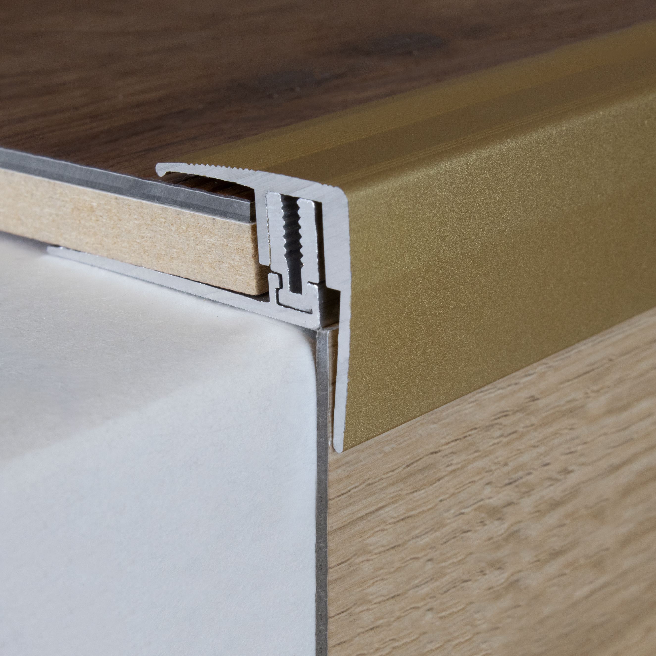 - GRÖSSE: Das Winkelprofil mit den Abmessungen 44 x 7 - 15.5 x 900 mm besitzt eine Einfasshöhe von 7 - 15.5 mm und schafft einen sauberen Abschluss an der Treppenkante.